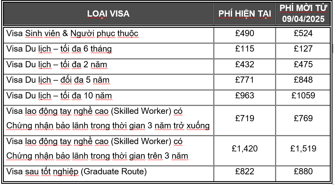 PHÍ VISA ANH CHÍNH THỨC TĂNG TỪ 09/04/2025