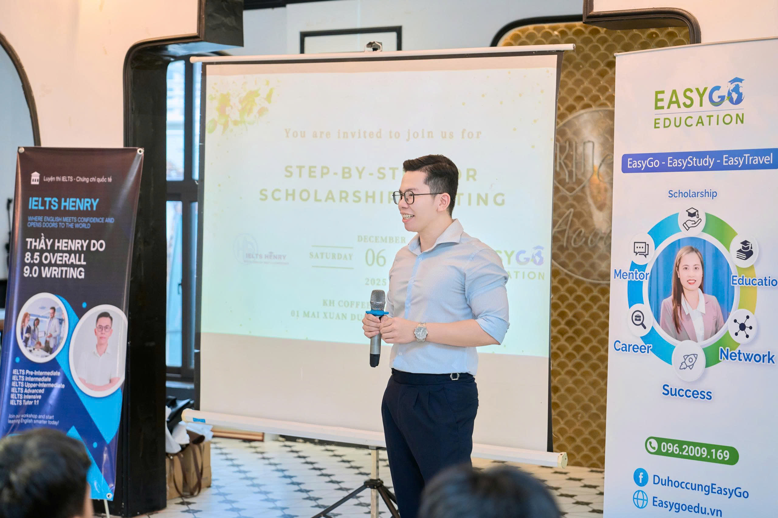 Ngày 06/12, sự kiện “Step-by-step for Scholarship Hunting” do EasyGo Education phối hợp cùng Trung tâm luyện thi IELTS Henry tổ chức đã diễn ra thành công tại Thanh Hóa, thu hút sự tham gia của đông đảo các bạn học sinh – sinh viên đang quan tâm đến du học và học bổng quốc tế.